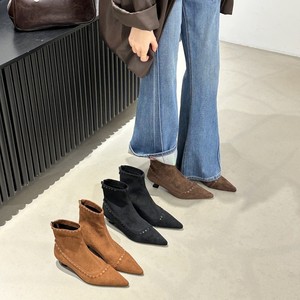 2025秋季新款铆钉时装靴女小众弹力靴后拉链细跟裸靴尖头瘦瘦靴