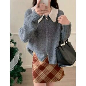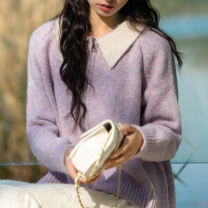 素色左岸慵懒风宽松紫色拉链翻领毛衣外套女秋季新款显瘦针织开衫