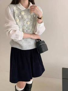 韩系圆领立体花朵软糯针织马甲女秋冬新款宽松甜美毛衣背心无袖潮
