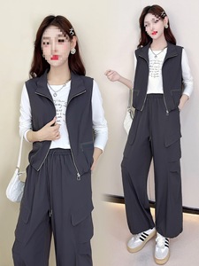 时尚休闲套装女2025秋季新款洋气宽松显瘦马甲T恤工装裤三件套潮