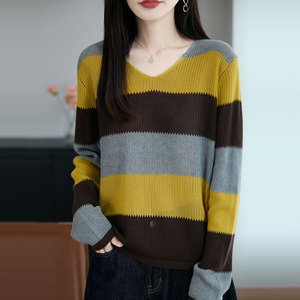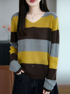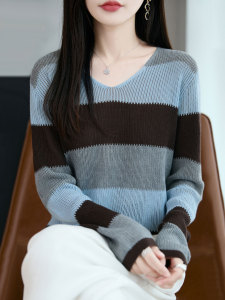 【厂家直供】秋季新款V领女士毛衣撞色条纹薄款宽松百搭时尚打底