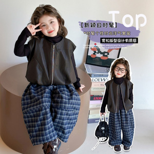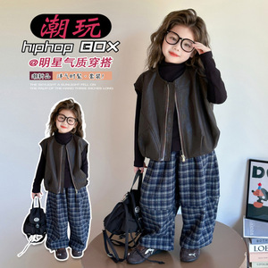 女童秋装套装2025新款女小童春秋款打底衫洋气儿童皮马甲三件套潮
