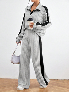 2025跨境欧美亚马逊时尚休闲polo领拼色设计宽松卫衣阔腿裤两件套