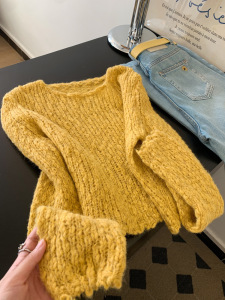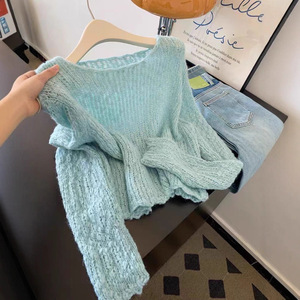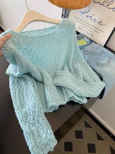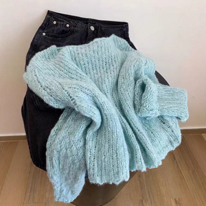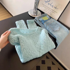 蓝色长袖外穿套头毛衣女士小个子慵懒风高级感针织衫上衣2025新款