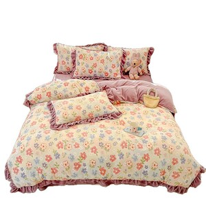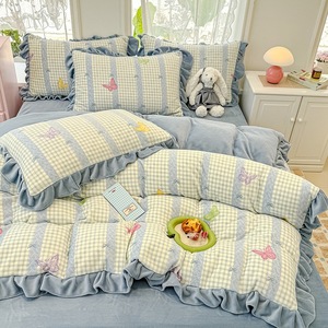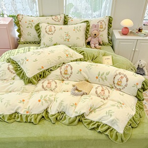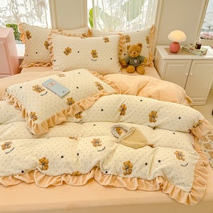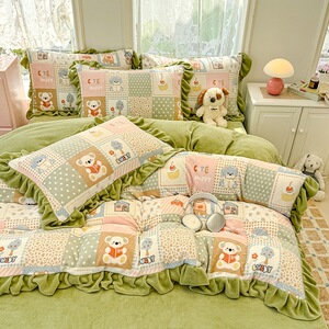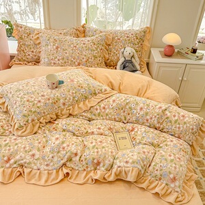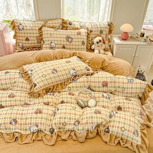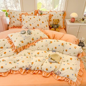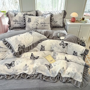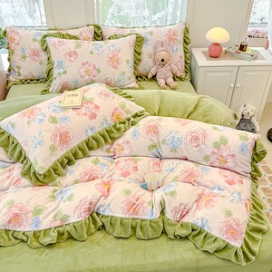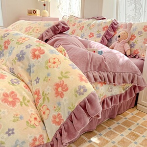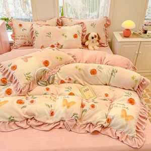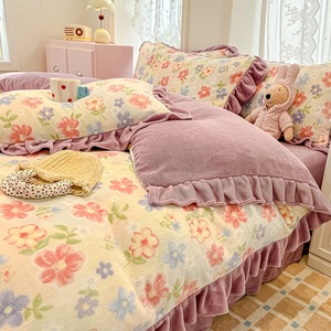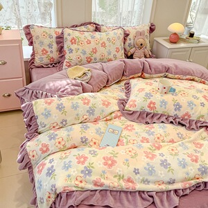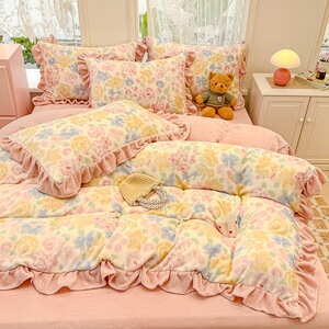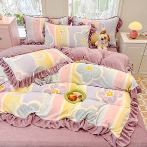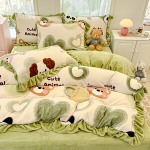 冬季加厚牛奶绒四件套韩版花边加绒被套床单保暖双面绒被罩三件套