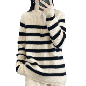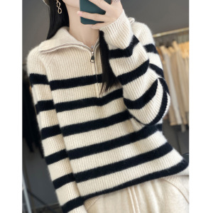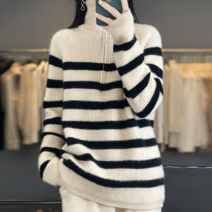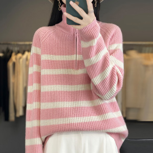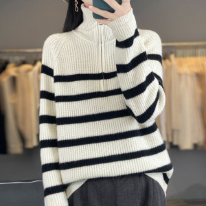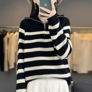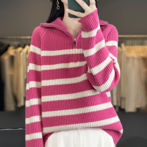 100%纯羊毛2025秋冬新女式宽松半拉链翻领拼色条纹加厚针织衫毛衣