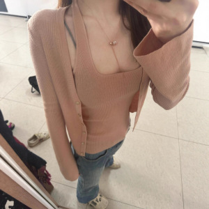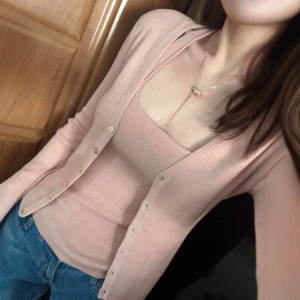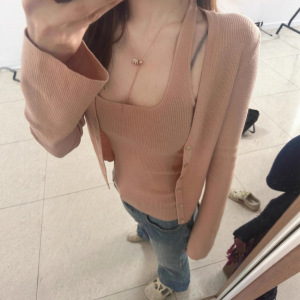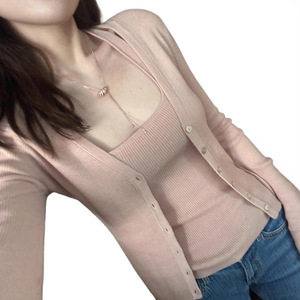 2025超好看秋季粉色针织开衫配吊带纯欲修身辣妹上衣背心套装