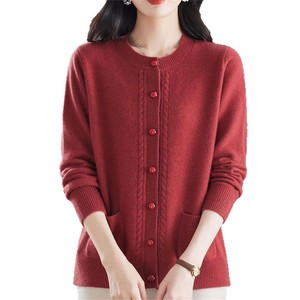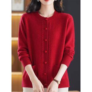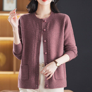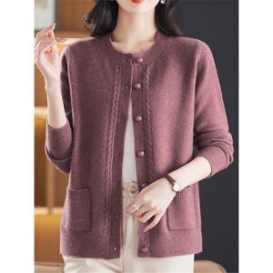 2025年秋冬季新款时尚宽松洋气圆领带口袋针织外套毛衣开衫上衣女