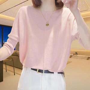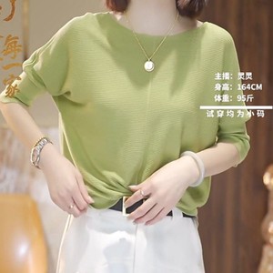 春夏气质薄款针织衫上衣女大码洋气纯色宽松圆领纹理七分袖打底衫