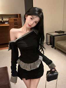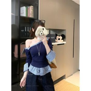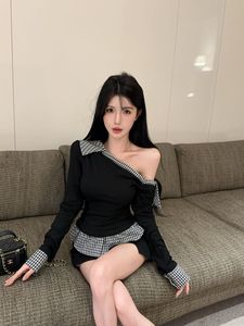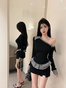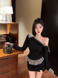 假两件斜肩格子衬衫女秋季辣妹一字肩小上衣打底衫内搭巨好看绝美