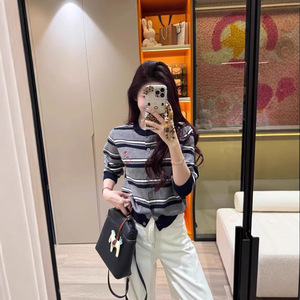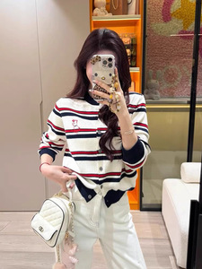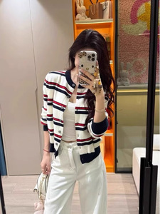 小香风撞色条纹刺绣针织开衫女春秋单排扣短款外套修身慵懒风上衣