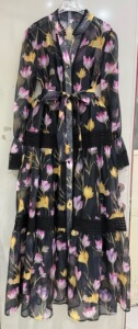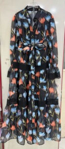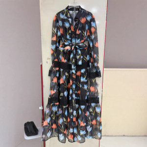 2025春秋新欧美亚马逊时尚印花 花边拼接长袖气质腰带轻奢连衣裙