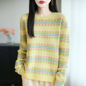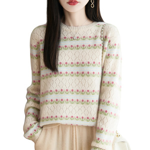 100%纯羊毛2025秋冬新女短款宽松圆领镂空提花套头打底针织衫毛衣