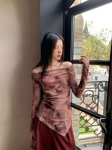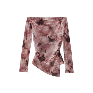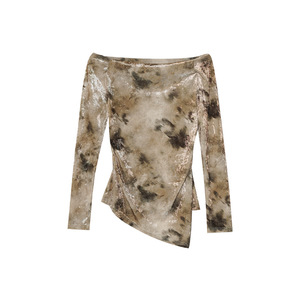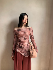 诠释美 NEWOPEN 25秋跨境复古锁骨露肩不规则扎染长袖上衣女F6227
