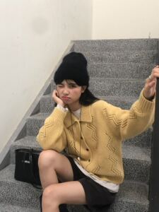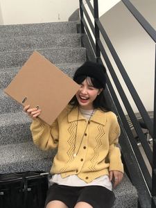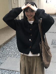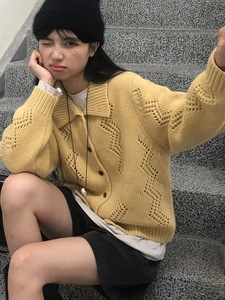 韩代H.ONE镂空翻领毛衣外套女秋冬新款宽松百搭针织开衫上衣 1348
