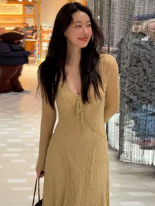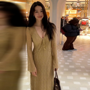 2025新款法式v领蕾丝针织长袖连衣裙子女早秋季修身掐腰包臀长裙