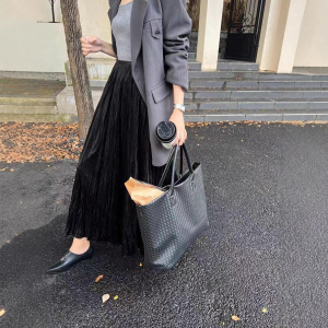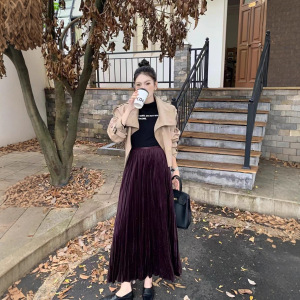 秋冬新款韩版简约高腰显瘦百褶丝绒裙女宽松A字半身裙中长款百搭