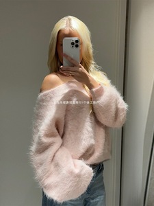 欧美跨境海马毛宽松纯色毛衣女士休闲单肩斜领长袖通勤套头衫ins
