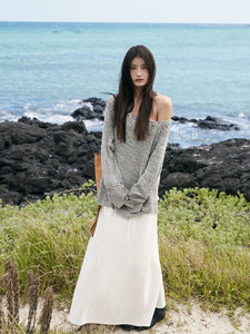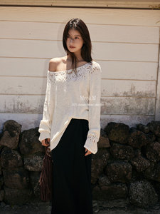Mega.M十三行极简领口法式印花设计感上衣女寻野镂空领口长袖毛衣