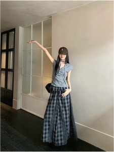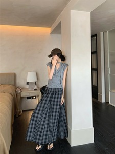 2025新款时尚套装灰色扭结短袖T恤女装夏季高腰格纹半身裙两件套