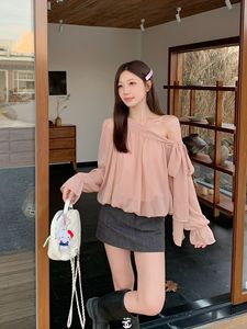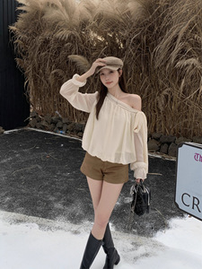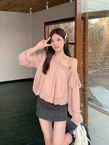 大码女装秋新款洋气温柔飘逸斜肩外穿设计感绑带衬衫上衣女