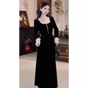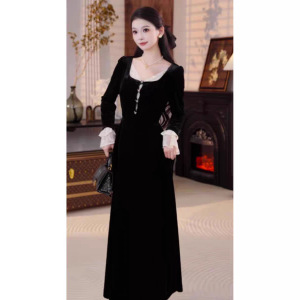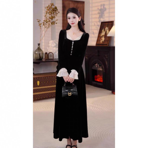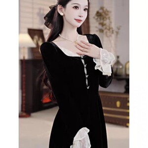 一桐专属玫瑰庄园法式宫廷蕾丝撞色丝绒连衣裙T53LQC3115