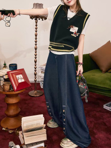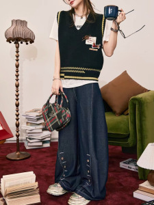早秋【跑跑小狗】有趣的叠穿 撞色V领针织马夹背心