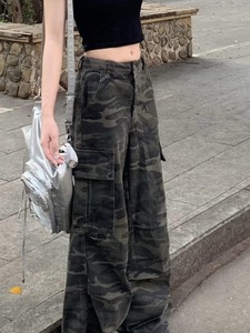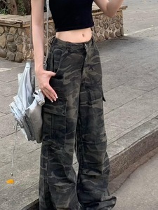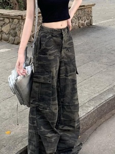 美式高街迷彩牛仔工装裤女新款复古大码胖mm宽松显瘦直筒阔腿裤子