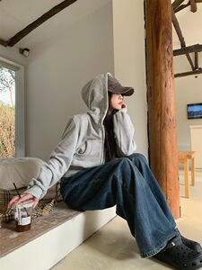 经典加厚加绒长袖卫衣外套女秋季2025新款灰色宽松显瘦连帽上衣潮