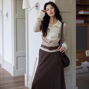 贰羊设计【苏予】假两件衬衫拼接针织衫女新款设计感缎面衬衣