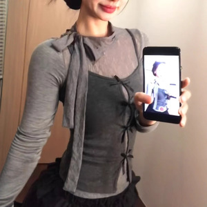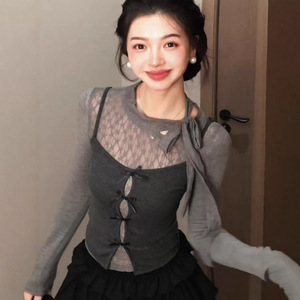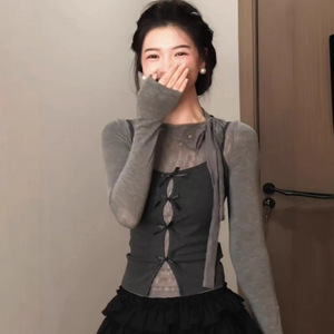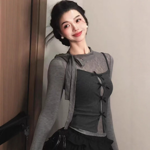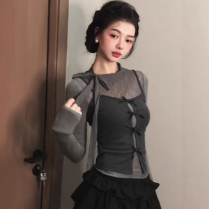 灰色辣妹蝴蝶结真两件长袖t恤女秋季设计感纯欲风修身打底衫上衣