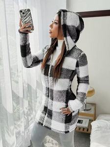 欧美跨境爆款格子印花双面毛绒连帽拉链开衫修身长款秋冬毛绒外套