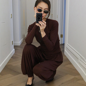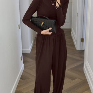 欧美跨境莫代尔纯色针织女式睡衣长袖长裤家居服套装2025秋冬新款