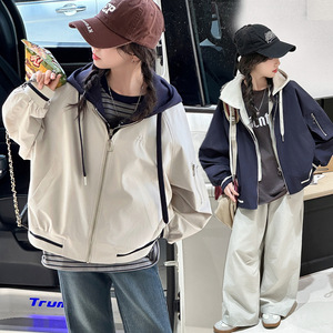 女童外套秋装2025新款儿童洋气假两件连帽外套中大童时尚冲锋衣潮