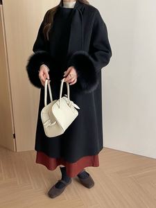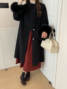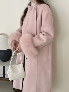 2025新款名媛狐狸毛袖高级感斗篷爆款羊毛大衣女双面羊绒毛呢外套
