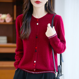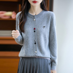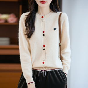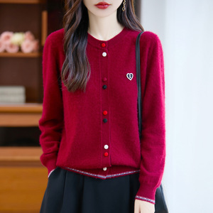 纯羊毛衫女式圆领针织开衫保暖外套秋冬新款彩色包扣设计爱心提花