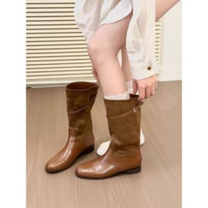 复古拼接圆头皮带扣中筒靴女2025秋冬新款平底休闲百搭西部牛仔靴
