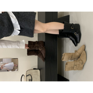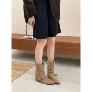 法式复古绒面短靴2025年秋冬新款美拉德尖头西部靴显瘦粗跟骑士靴