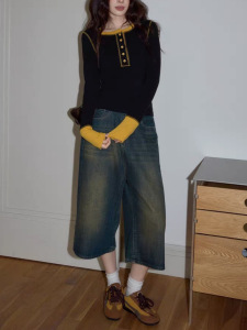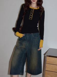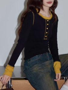 设计感黑色圆领拼接T恤女2025秋高级气质收腰修身长袖上衣