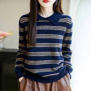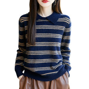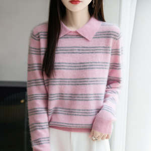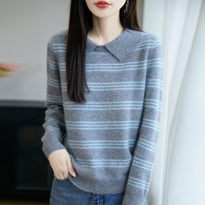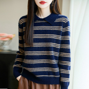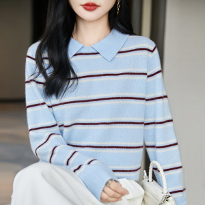 100%纯羊毛2025秋冬新款女式宽松Polo领条纹短款打底针织衫毛衣