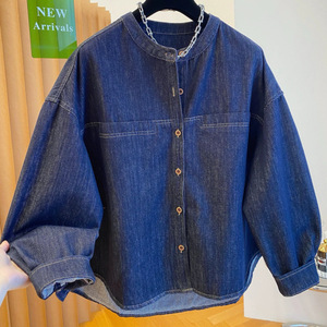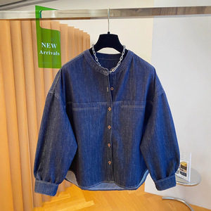 感蓝色牛仔衬衫女长袖2025新款秋季宽松圆领衬衣夹克外套上衣
