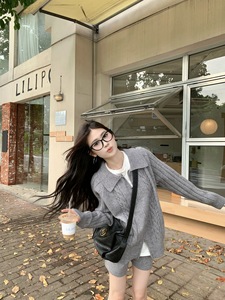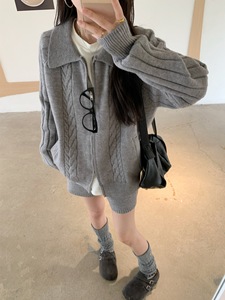 双拉链复古麻花翻领毛衣外套女秋季慵懒风套装针织直筒短裤两件套