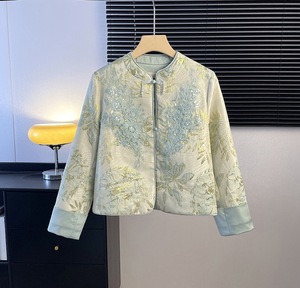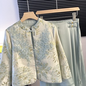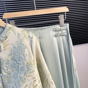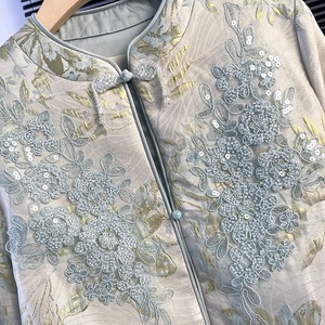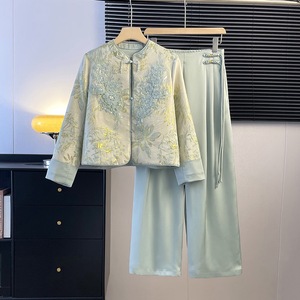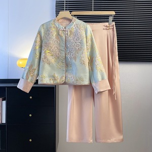 实拍新中式民族风立领盘扣重工提花刺绣亮片上衣搭配唐装长裤套装