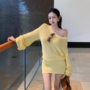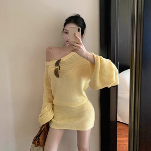 实拍2025!纯欲辣妹斜肩黄色长袖针织连衣裙女宽松休闲收腰短裙