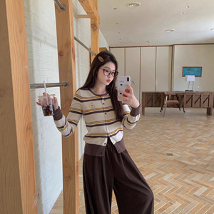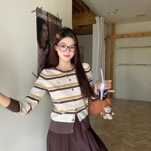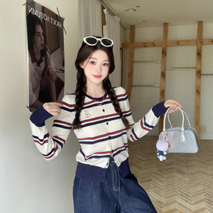 高级感撞色条纹小狗刺绣薄款针织衫女2025早秋宽松休闲开衫上衣