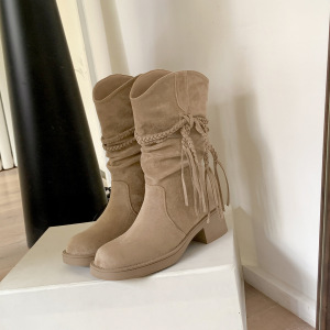 牛皮版 埃及靴~2025秋冬款流苏粗跟中高筒长靴西部牛仔靴女堆堆靴