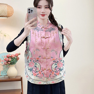 2025秋季新款立领单排扣无袖马甲撞色拼接刺绣缎面民族风马甲女
