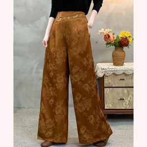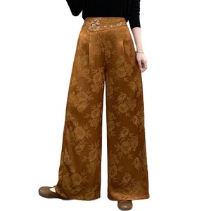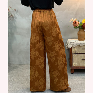 2025秋季新款松紧腰大码显瘦直筒裤纯色民族风刺绣缎面提花阔腿裤