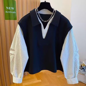 假两件条纹拼接POLO领卫衣女装2025秋季宽松显瘦百搭洋气减龄上衣