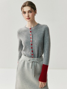 轻奢羊绒!秋冬款女士气质文艺百搭圆领袖口拼色羊绒开衫针织外套